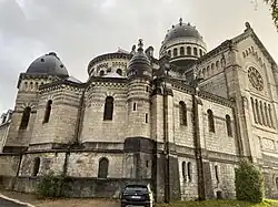 La basilique est de style romano-byzantin, et sa façade antérieure est calée par deux imposantes tours, dans lesquelles sont respectivement insérés : à gauche un baromètre et à droite une horloge. Sous le chœur, le transept et une partie de la nef existe une crypte accessible par deux escaliers situés latéralement. Cinq chapelles sont situées autour de l'abside et des peintures murales réalisées par des artistes originaires de la ville se déroulent au-dessus des grandes arcades de la nef. Pierre Pfister est chargé du programme de décoration inspiré de ses recherches archéologiques dans les catacombes romaines.