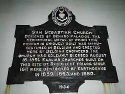 En 1621, don Bernardino Castillo, un généreux mécène et un dévot du martyr romain saint Sébastien, fait don du terrain sur lequel l'église est bâtie. La première église, construite en bois, brûle en 1651 lors d'une rébellion chinoise à Manille. Reconstruite une première fois en briques, la deuxième église et celles qui lui succéderont seront détruites par le feu ou les tremblements de terre de 1859, 1863 et 1880.