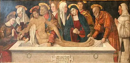 Les travaux reprennent sous Louis XII en 1508 avec la nomination d'un nouveau prieur, Jean Damiani, qui exercera le plus long prieurat du couvent durant trente cinq ans de 1508 à 1543. Les travaux de la sixième travée sont repris et terminés en 1513 sous la direction de l'architecte Hugues Caillat[29]. Les trois premières travées sont achevées en 1532 après quelques interruptions dues notamment à la peste. L'inscription gothique du XVIe siècle, au revers de la façade rappelle ces étapes. Les architectes seront Pierre Garcin et son père Jean Garcin[30].