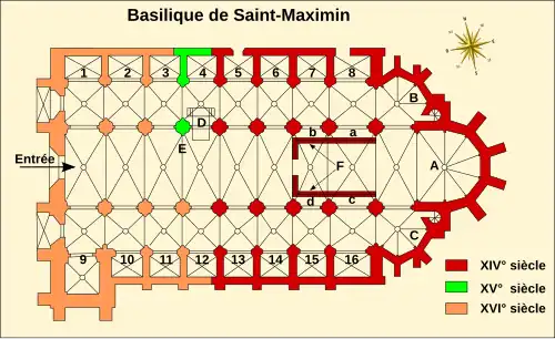 En 1295, Charles II d'Anjou, devenu comte de Provence et roi de Sicile, décide de faire construire sur les lieux mêmes de l'invention des reliques, une basilique et un couvent de dominicains. Il confie l'établissement des plans de l'ensemble de la construction au « Magister Petrus Gallicus, protomagister operum curiæ ». Or, à cette date, ce protomagister est Pierre d'Angicourt, mais il n'est pas certain qu'il ait effectivement réalisé le début de la construction[25]. Après quelques années d'arrêt, la reprise des travaux de 1300 à 1316 avec l'architecte du palais des comtes de Provence, Jean Baudici[26], s'effectue avec une grande ampleur à partir de 1305[27]. Ce renouveau a été possible grâce à la nomination à la tête du couvent de Saint-Maximin, de Jean Gobi qui en sera le prieur de 1304 à 1328[28]. En 1320, le chevet est terminé avec la première travée des trois nefs. Les quatre travées suivantes sont réalisées de 1330 à 1345. L'entrée de la crypte se situe alors en dehors de l'église. En 1404, on sait que l'abside et les cinq dernières travées de la nef étaient terminées. Jean II Le Meingre, dit Boucicaut, maréchal de France, décide pour couvrir la crypte de faire édifier la partie nord de la quatrième travée[25] ; la crypte est alors nivelée à hauteur du sol de la nouvelle basilique.