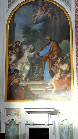 Ce tableau a été réalisé par Placido Costanzi pour l'autel Tabitha (ou Dorcas) de la basilique vaticane. Il a été déplacé dans cette basilique après avoir été remplacé par une copie en mosaïque du même tableau[29].