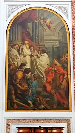 Il s'agit d'une copie réalisée par Pierre Charles Trémolliére du tableau de Francesco Vanni qui se trouve sur l'autel du Sacré-Cœur à Saint-Pierre. Le tableau raconte la chute de Simon Magus qui voulait acheter à saint Pierre la capacité de faire des miracles. Le tableau symbolise la suprématie de l'orthodoxie catholique sur l'hérésie[26].