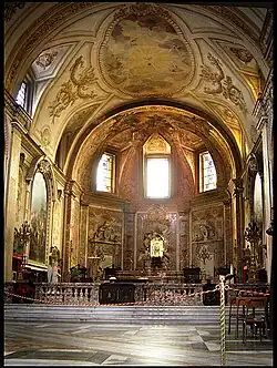 Dans l'abside pentagonale peinte en rouge, deux portes sont surmontées des bustes de saint Charles Borromée et Pie IV et de deux dalles commémoratives du pontife et du cardinal Serbelloni (le premier évêque titulaire de l'église). Au centre, au sein d'une gloire d'anges et de chérubins sculptés par Bernardino Ludovisi, se trouve le tableau de la Madonna degli Angeli qu'Antonio Del Duca a fait réaliser à Venise en 1543. L'auteur est inconnu même si le style remonte à Lorenzo Lotto. La Madone est représentée en train d'allaiter Jésus et est donc appelée Vierge du lait. Les archanges Michel (à gauche) et Gabriel (à droite) tiennent la couronne sur la tête de la Vierge Marie. Tous les archanges tiennent les parchemins avec leurs tâches écrites dessus[46].