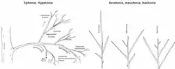 Ce mode de ramification contrôlé par le phénomène de dominance apicale qui règle le développement relatif des bourgeons terminaux, est le contraire de l'acrotonie caractéristique du port arborescent. De nombreuses formes intermédiaires peuvent être observées[1].
