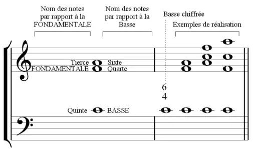 Dans l'exemple ci-contre, le chiffrage de l'accord de trois sons do-fa-la (deuxième renversement de fa-la-do, dont la fondamentale est fa), est effectué au moyen de deux chiffres, un « 4 » et un « 6 », au-dessus du do de la basse. Ici, le « 4 », signifie bien une « quarte » par rapport à la basse, et représente la fondamentale de l'accord — fa —, et le « 6 » indique une « sixte » par rapport à la basse, et représente la tierce de l'accord — la —. On remarquera que la tierce « de l'accord » (ici, Fa) n'est pas nécessairement la tierce « de la basse » (qui serait ici un mi). Il est donc très prudent, lorsqu'on parle par exemple d'une « tierce », de préciser s'il s'agit de la tierce « de l'accord » — autrement dit, la tierce de la fondamentale — ou bien s'il s'agit de la tierce « de la basse », représentée par le chiffrage, ceci, afin d'éviter tout malentendu en cas d'accord renversé.