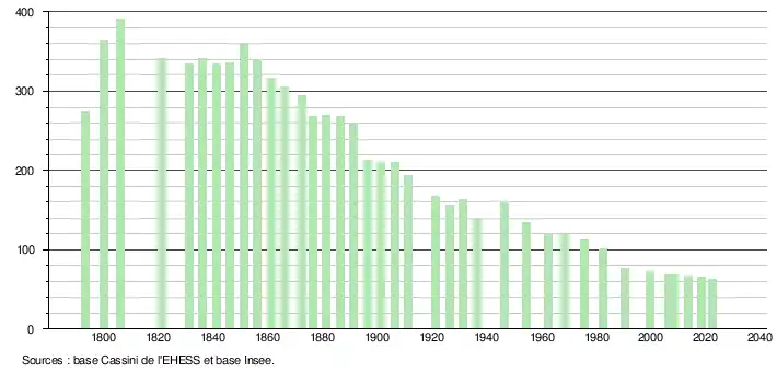 L'évolution du nombre d'habitants est connue à travers les recensements de la population effectués dans la commune depuis 1793. Pour les communes de moins de 10 000 habitants, une enquête de recensement portant sur toute la population est réalisée tous les cinq ans, les populations de référence des années intermédiaires étant quant à elles estimées par interpolation ou extrapolation[15]. Pour la commune, le premier recensement exhaustif entrant dans le cadre du nouveau dispositif a été réalisé en 2008[16].
