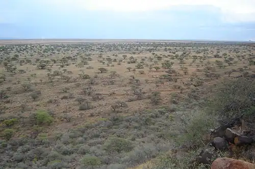 Le site de la bataille de nos jours, vue de la plaine de la colline vers le sud. Les tranchées boers restent visibles