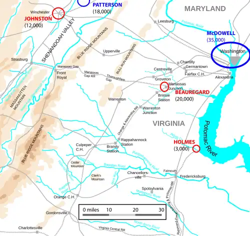 McDowel avait prévu d'immobiliser l'armée du général Johnston dans la vallée de Shenandoah par une attaque de Robert Patterson et des 18 000 hommes de la première armée de la Shenandoah[note 6]. Il avait informé le général Scott que le plan d'attaque ne pouvait réussir que si Johnston était bloqué dans la vallée de la Shenandoah.