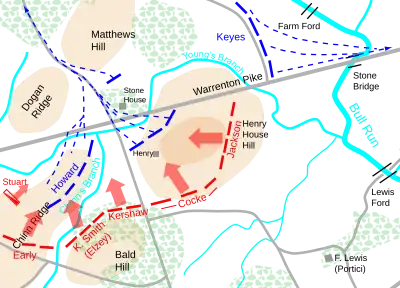 Evans reçut bientôt en renfort les deux brigades du brigadier général Barnard Elliott Bee, Jr. et du colonel Francis S. Bartow, amenant le total des forces du flanc nord à 2 800 hommes[12]. Ils parvinrent à ralentir la brigade de tête de Hunter (commandée par le brigadier général Ambrose E. Burnside) qui tentait de passer à gué la rivière Bull Run et d'avancer vers la rivière Young Branch au nord de la colline Henry House. L'un des chefs de la brigade de Tyler (le colonel William Tecumseh Sherman) traversa un gué non protégé et chargea le flanc droit des confédérés. Cette attaque surprise, combinée à la pression de Burnside et du major George Sykes, provoqua une rupture de la ligne confédérée peu après 11 h 30, les confédérés se replièrent en déroute vers Henry Hill[14].