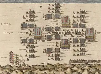 La première ligne d'infanterie hollandaise prend position sur la ligne de crête des dunes, les canons couvrant ses deux ailes par des tirs d'enfilade ; Maurice de Nassau y a placé ses meilleurs régiments, commandés par un officier anglais aguerri, Francis Vere.