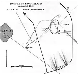 Lorsque Mikawa attaqua la force alliée au sud, les capitaines des trois croiseurs américains du groupe nord dormaient et leurs navires naviguaient tranquillement à la vitesse de 19 km/h (10 nœuds)[b 13]. Même si les équipages avaient observé les explosions au sud de l'île de Savo et avaient reçu le message de l'USS Patterson alertant de l'arrivée de navires inconnus dans la zone, il fallut un certain temps pour que les navires soient prêts au combat[c 20]. À 1 h 44, les croiseurs japonais commencèrent à tirer des torpilles contre le groupe nord et à 1 h 50, ils braquèrent de puissants projecteurs sur les croiseurs américains et ouvrirent le feu[a 18]. L'équipage de l'USS Astoria rejoignit ses postes de combat vers 1 h 49 et à 1 h 52, les obus japonais commencèrent à tomber autour du navire. Les artilleurs de la batterie principale de l'USS Astoria repérèrent les croiseurs japonais et ouvrirent le feu. Le capitaine de l'USS Astoria, qui était en train de dormir, se précipita sur le pont et ordonna un cessez-le-feu car il craignait de tirer sur des forces alliées. Comme les obus continuaient de pleuvoir, le capitaine ordonna une reprise des tirs moins d'une minute plus tard. Le Chōkai avait néanmoins ajusté ses tirs et le croiseur américain fut touché par plusieurs obus et prit feu[b 14],[16]. Entre 2 heures et 2 h 15, l'Aoba, le Kinugasa et le Kako rejoignirent le Chōkai pour canonner l'USS Astoria. La salle des machines fut détruite et le navire en flammes s'arrêta. À 2 h 16, l'une des dernières tourelles principales encore opérationnelle de l'USS Astoria tira sur le projecteur du Kinugasa mais le manqua et la tourelle avant du Chōkai fut touchée et mise hors de combat[c 21].