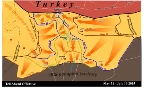 Le 14 juin, les Kurdes du canton de Kobané à l'ouest et ceux du canton de Cizir à l'est font leur jonction et coupent la route de Tall Abyad à Raqqa[26]. Les djihadistes reculent et détruisent derrière eux deux ponts dans deux villages au sud et au sud-ouest de la ville, ce qui n'empêche par les Kurdes et les rebelles d'avancer. Ces derniers atteignent Tall Abyad le 14 juin et affrontent les forces de l'EI à un barrage à l'entrée sud-est de la ville[28],[29],[30]. Les djihadistes envoient un kamikaze avec un véhicule piégé sur un poste au sud-ouest de la ville, l'explosion tue quatre combattants des YPG et deux médecins. Cependant les Kurdes parviennent à entrer dans la ville, la coalition mène cinq frappes aériennes, et le matin du 15 juin le quartier de Machour Tahtania, au sud-est, est conquis. Selon l'OSDH, au moins trois Kurdes et onze djihadistes ont été tués dans ces combats[31],[32],[33]. Puis dans l'après-midi, le poste-frontière de ville est pris à son tour[4]. Enfin dans la soirée, les Kurdes des YPG prennent le contrôle de la totalité de la ville, seules quelques petites poches de résistance restent tenue par une poignée de combattants de l'EI[34],[35]. Selon l'OSDH, les djihadistes tentent de se replier sur Ayn Isa au sud, mais ciblés par la coalition, 40 d'entre eux sont tués au cours de la retraite[36],[35].