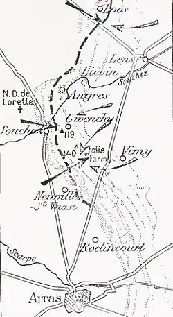 Le à midi, la 10e armée française attaque en direction de Vimy, la 1re armée anglaise en direction de Loos. Les deux armées doivent déborder Lens, grand centre minier, par le nord et par le sud.