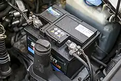 Les batteries de ces véhicules sont généralement au plomb, constituées de six cellules galvaniques en série. Chaque cellule fournit 2,1 V pour un total de 12,6 V[7]. Elles sont constituées d'une alternance de plaques en plomb (cathode) et en plomb/dioxyde de plomb (anode) immergées dans une solution d'acide sulfurique, qui sert d'électrolyte[8].