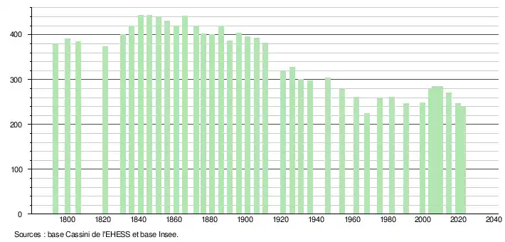 L'évolution du nombre d'habitants est connue à travers les recensements de la population effectués dans la commune depuis 1793. Pour les communes de moins de 10 000 habitants, une enquête de recensement portant sur toute la population est réalisée tous les cinq ans, les populations de référence des années intermédiaires étant quant à elles estimées par interpolation ou extrapolation[11]. Pour la commune, le premier recensement exhaustif entrant dans le cadre du nouveau dispositif a été réalisé en 2004[12].