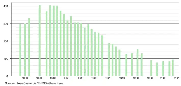 - ↑ Dans le tableau des recensements et le graphique, par convention dans Wikipédia, le principe a été retenu, pour les populations légales postérieures à 1999 de n’afficher dans le tableau des recensements et le graphique que les populations correspondant à l'année 2006, première population légale publiée calculée conformément aux concepts définis dans le décret no 2003-485 du 5 juin 2003, et les années correspondant à une enquête exhaustive de recensement pour les communes de moins de 10 000 habitants, ainsi que la dernière population légale publiée par l’Insee.