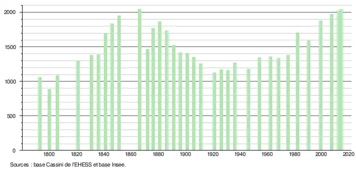 L'évolution du nombre d'habitants est connue à travers les recensements de la population effectués dans la commune depuis 1793. À partir du , les populations légales des communes sont publiées annuellement dans le cadre d'un recensement qui repose désormais sur une collecte d'information annuelle, concernant successivement tous les territoires communaux au cours d'une période de cinq ans. Pour les communes de moins de 10 000 habitants, une enquête de recensement portant sur toute la population est réalisée tous les cinq ans, les populations légales des années intermédiaires étant quant à elles estimées par interpolation ou extrapolation[15]. Pour la commune, le premier recensement exhaustif entrant dans le cadre du nouveau dispositif a été réalisé en 2007[16],[Note 1].