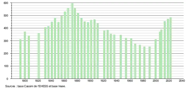L'évolution du nombre d'habitants est connue à travers les recensements de la population effectués dans la commune depuis 1793. Pour les communes de moins de 10 000 habitants, une enquête de recensement portant sur toute la population est réalisée tous les cinq ans, les populations de référence des années intermédiaires étant quant à elles estimées par interpolation ou extrapolation[17]. Pour la commune, le premier recensement exhaustif entrant dans le cadre du nouveau dispositif a été réalisé en 2008[18].