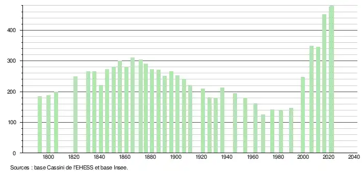 | L'évolution du nombre d'habitants est connue à travers les recensements de la population effectués dans la commune depuis 1793. Pour les communes de moins de 10 000 habitants, une enquête de recensement portant sur toute la population est réalisée tous les cinq ans, les populations de référence des années intermédiaires étant quant à elles estimées par interpolation ou extrapolation[27]. Pour la commune, le premier recensement exhaustif entrant dans le cadre du nouveau dispositif a été réalisé en 2006[28]. En 2022, la commune comptait 479 habitants[Note 3], en évolution de +6,21 % par rapport à 2016 (Haute-Garonne : +8,02 %, France hors Mayotte : +2,11 %). |