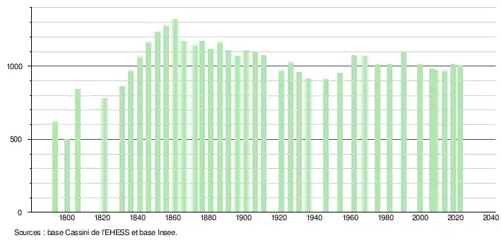 L'évolution du nombre d'habitants est connue à travers les recensements de la population effectués dans la commune depuis 1793. Pour les communes de moins de 10 000 habitants, une enquête de recensement portant sur toute la population est réalisée tous les cinq ans, les populations de référence des années intermédiaires étant quant à elles estimées par interpolation ou extrapolation[29]. Pour la commune, le premier recensement exhaustif entrant dans le cadre du nouveau dispositif a été réalisé en 2008[30].
