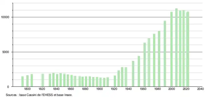 - ↑ Par convention dans Wikipédia, le principe a été retenu de n’afficher dans le tableau des recensements et le graphique, pour les populations de référence postérieures à 1999, que les populations correspondant à une enquête exhaustive de recensement pour les communes de moins de 10 000 habitants, et que les populations des années 2006, 2011, 2016, etc. pour les communes de plus de 10 000 habitants, ainsi que la dernière population de référence publiée par l’Insee pour l'ensemble des communes.