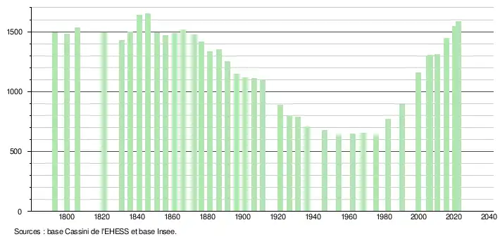 L'évolution du nombre d'habitants est connue à travers les recensements de la population effectués dans la commune depuis 1793. Pour les communes de moins de 10 000 habitants, une enquête de recensement portant sur toute la population est réalisée tous les cinq ans, les populations de référence des années intermédiaires étant quant à elles estimées par interpolation ou extrapolation[34]. Pour la commune, le premier recensement exhaustif entrant dans le cadre du nouveau dispositif a été réalisé en 2005[35].