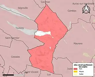 Le retrait-gonflement des sols argileux est susceptible d'engendrer des dommages importants aux bâtiments en cas d’alternance de périodes de sécheresse et de pluie. 95,5 % de la superficie communale est en aléa moyen ou fort (88,8 % au niveau départemental et 48,5 % au niveau national). Sur les 70 bâtiments dénombrés sur la commune en 2019, 67 sont en aléa moyen ou fort, soit 96 %, à comparer aux 98 % au niveau départemental et 54 % au niveau national. Une cartographie de l'exposition du territoire national au retrait gonflement des sols argileux est disponible sur le site du BRGM[23],[Carte 3].