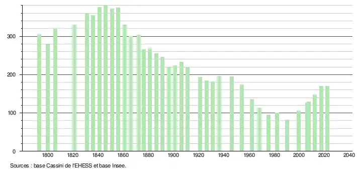 L'évolution du nombre d'habitants est connue à travers les recensements de la population effectués dans la commune depuis 1793. Pour les communes de moins de 10 000 habitants, une enquête de recensement portant sur toute la population est réalisée tous les cinq ans, les populations de référence des années intermédiaires étant quant à elles estimées par interpolation ou extrapolation[25]. Pour la commune, le premier recensement exhaustif entrant dans le cadre du nouveau dispositif a été réalisé en 2007[26].