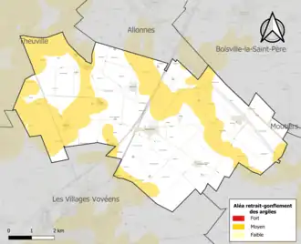 Le retrait-gonflement des sols argileux est susceptible d'engendrer des dommages importants aux bâtiments en cas d’alternance de périodes de sécheresse et de pluie. 35,8 % de la superficie communale est en aléa moyen ou fort (52,8 % au niveau départemental et 48,5 % au niveau national). Sur les 156 bâtiments dénombrés sur la commune en 2019, 37 sont en aléa moyen ou fort, soit 24 %, à comparer aux 70 % au niveau départemental et 54 % au niveau national. Une cartographie de l'exposition du territoire national au retrait gonflement des sols argileux est disponible sur le site du BRGM[19],[Carte 2].