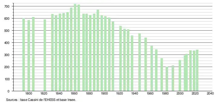 L'évolution du nombre d'habitants est connue à travers les recensements de la population effectués dans la commune depuis 1793. Pour les communes de moins de 10 000 habitants, une enquête de recensement portant sur toute la population est réalisée tous les cinq ans, les populations de référence des années intermédiaires étant quant à elles estimées par interpolation ou extrapolation[25]. Pour la commune, le premier recensement exhaustif entrant dans le cadre du nouveau dispositif a été réalisé en 2008[26].