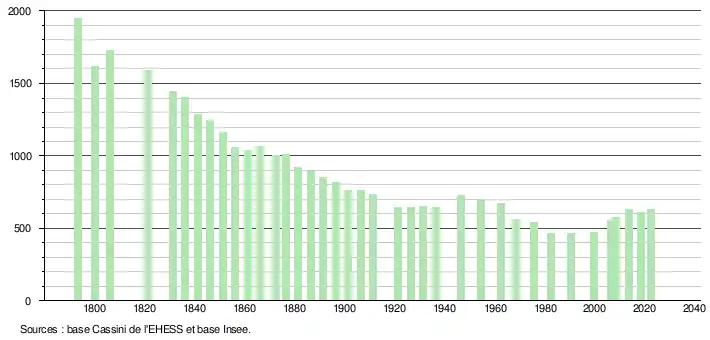 L'évolution du nombre d'habitants est connue à travers les recensements de la population effectués dans la commune depuis 1793. Pour les communes de moins de 10 000 habitants, une enquête de recensement portant sur toute la population est réalisée tous les cinq ans, les populations de référence des années intermédiaires étant quant à elles estimées par interpolation ou extrapolation[27]. Pour la commune, le premier recensement exhaustif entrant dans le cadre du nouveau dispositif a été réalisé en 2008[28].