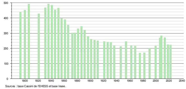 L'évolution du nombre d'habitants est connue à travers les recensements de la population effectués dans la commune depuis 1793. Pour les communes de moins de 10 000 habitants, une enquête de recensement portant sur toute la population est réalisée tous les cinq ans, les populations de référence des années intermédiaires étant quant à elles estimées par interpolation ou extrapolation[24]. Pour la commune, le premier recensement exhaustif entrant dans le cadre du nouveau dispositif a été réalisé en 2008[25].