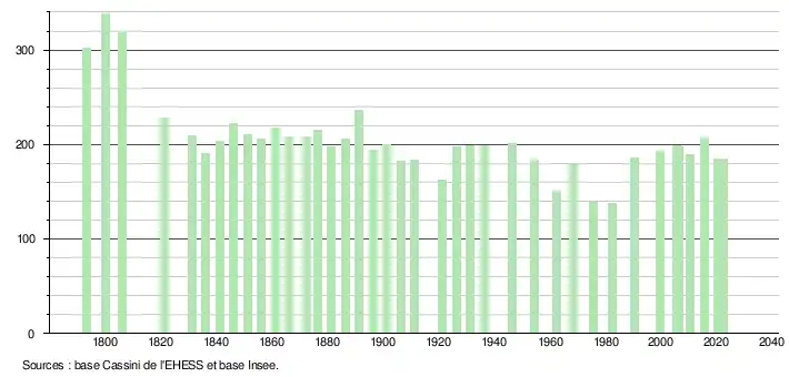 L'évolution du nombre d'habitants est connue à travers les recensements de la population effectués dans la commune depuis 1793. Pour les communes de moins de 10 000 habitants, une enquête de recensement portant sur toute la population est réalisée tous les cinq ans, les populations de référence des années intermédiaires étant quant à elles estimées par interpolation ou extrapolation[43]. Pour la commune, le premier recensement exhaustif entrant dans le cadre du nouveau dispositif a été réalisé en 2005[44].