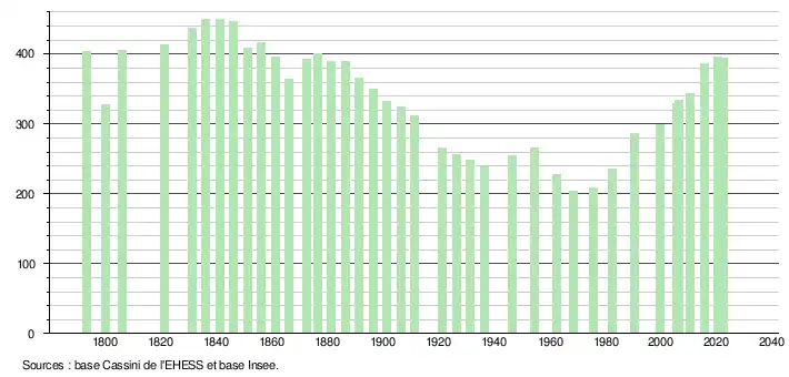 L'évolution du nombre d'habitants est connue à travers les recensements de la population effectués dans la commune depuis 1793. Pour les communes de moins de 10 000 habitants, une enquête de recensement portant sur toute la population est réalisée tous les cinq ans, les populations de référence des années intermédiaires étant quant à elles estimées par interpolation ou extrapolation[14]. Pour la commune, le premier recensement exhaustif entrant dans le cadre du nouveau dispositif a été réalisé en 2005[15].