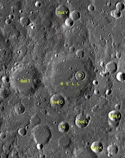 Les cratères dits satellites sont de petits cratères situés à proximité du cratère principal, ils sont nommés du même nom mais accompagné d'une lettre majuscule complémentaire (même si la formation de ces cratères est indépendante de la formation du cratère principal). Par convention ces caractéristiques sont indiquées sur les cartes lunaires en plaçant la lettre sur le point le plus proche du cratère principal. Liste des cratères satellites de Bell [7],[10] :