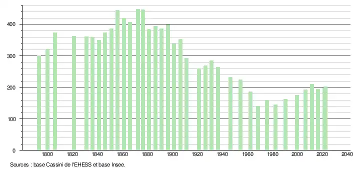 L'évolution du nombre d'habitants est connue à travers les recensements de la population effectués dans la commune depuis 1793. Pour les communes de moins de 10 000 habitants, une enquête de recensement portant sur toute la population est réalisée tous les cinq ans, les populations de référence des années intermédiaires étant quant à elles estimées par interpolation ou extrapolation[27]. Pour la commune, le premier recensement exhaustif entrant dans le cadre du nouveau dispositif a été réalisé en 2006[28].