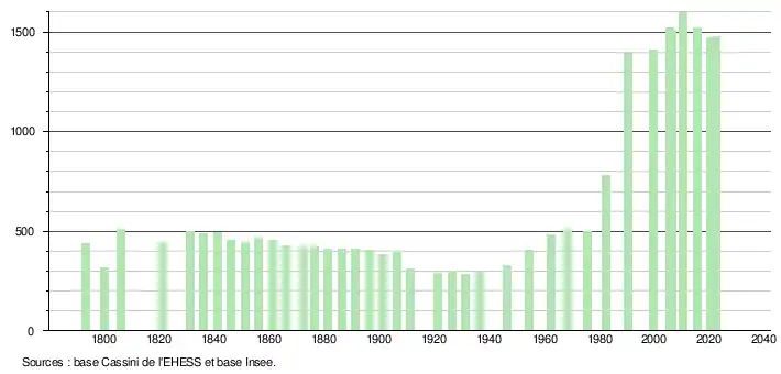 L'évolution du nombre d'habitants est connue à travers les recensements de la population effectués dans la commune depuis 1793. Pour les communes de moins de 10 000 habitants, une enquête de recensement portant sur toute la population est réalisée tous les cinq ans, les populations de référence des années intermédiaires étant quant à elles estimées par interpolation ou extrapolation[38]. Pour la commune, le premier recensement exhaustif entrant dans le cadre du nouveau dispositif a été réalisé en 2005[39].