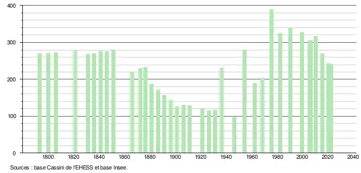 L'évolution du nombre d'habitants est connue à travers les recensements de la population effectués dans la commune depuis 1793. Pour les communes de moins de 10 000 habitants, une enquête de recensement portant sur toute la population est réalisée tous les cinq ans, les populations de référence des années intermédiaires étant quant à elles estimées par interpolation ou extrapolation[21]. Pour la commune, le premier recensement exhaustif entrant dans le cadre du nouveau dispositif a été réalisé en 2005[22].
