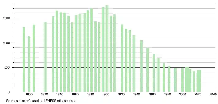 L'évolution du nombre d'habitants est connue à travers les recensements de la population effectués dans la commune depuis 1793. Pour les communes de moins de 10 000 habitants, une enquête de recensement portant sur toute la population est réalisée tous les cinq ans, les populations de référence des années intermédiaires étant quant à elles estimées par interpolation ou extrapolation[25]. Pour la commune, le premier recensement exhaustif entrant dans le cadre du nouveau dispositif a été réalisé en 2004[26].