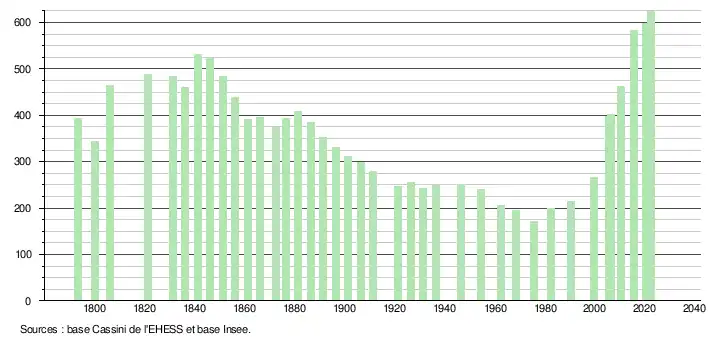 L'évolution du nombre d'habitants est connue à travers les recensements de la population effectués dans la commune depuis 1793. Pour les communes de moins de 10 000 habitants, une enquête de recensement portant sur toute la population est réalisée tous les cinq ans, les populations de référence des années intermédiaires étant quant à elles estimées par interpolation ou extrapolation[26]. Pour la commune, le premier recensement exhaustif entrant dans le cadre du nouveau dispositif a été réalisé en 2005[27].