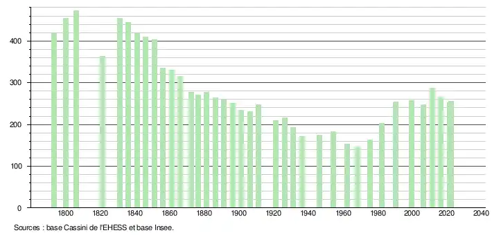 L'évolution du nombre d'habitants est connue à travers les recensements de la population effectués dans la commune depuis 1793. Pour les communes de moins de 10 000 habitants, une enquête de recensement portant sur toute la population est réalisée tous les cinq ans, les populations de référence des années intermédiaires étant quant à elles estimées par interpolation ou extrapolation[17]. Pour la commune, le premier recensement exhaustif entrant dans le cadre du nouveau dispositif a été réalisé en 2006[18].