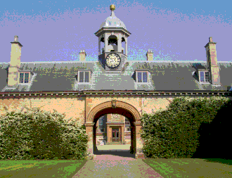 Le hall d'entrée principale, les salles de réceptions et les chambres à coucher familiales étaient situées au rez-de-chaussée et au premier étage au-dessus d'un sous-sol semi-enterré contenant les pièces des serviteurs[16]. Les deux entrées principales du manoir situées au centre des façades Nord et Sud sont accessibles via des escaliers externes. À l'origine, du côté Sud l'escalier était composé d'une double volée et du côté Nord d'une étroite volée, mais chacun a été remplacé depuis par une seule large volée de marches[20]