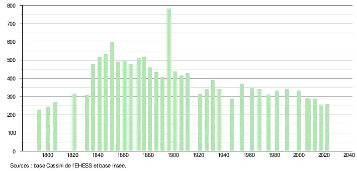 | L'évolution du nombre d'habitants est connue à travers les recensements de la population effectués dans la commune depuis 1793. Pour les communes de moins de 10 000 habitants, une enquête de recensement portant sur toute la population est réalisée tous les cinq ans, les populations de référence des années intermédiaires étant quant à elles estimées par interpolation ou extrapolation[34]. Pour la commune, le premier recensement exhaustif entrant dans le cadre du nouveau dispositif a été réalisé en 2007[35]. En 2022, la commune comptait 259 habitants[Note 5], en évolution de −2,26 % par rapport à 2016 (Aude : +2,65 %, France hors Mayotte : +2,11 %). |