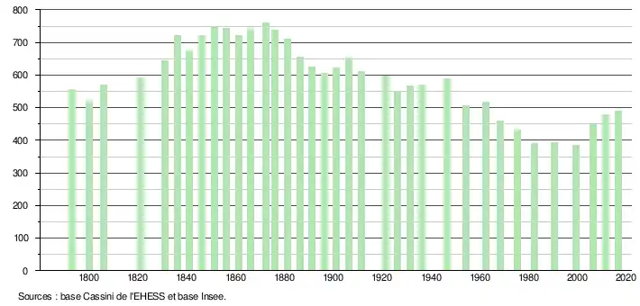 L'évolution du nombre d'habitants est connue à travers les recensements de la population effectués dans la commune depuis 1793. Pour les communes de moins de 10 000 habitants, une enquête de recensement portant sur toute la population est réalisée tous les cinq ans, les populations de référence des années intermédiaires étant quant à elles estimées par interpolation ou extrapolation[4]. Pour la commune, le premier recensement exhaustif entrant dans le cadre du nouveau dispositif a été réalisé en 2006[5].