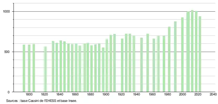L'évolution du nombre d'habitants est connue à travers les recensements de la population effectués dans la commune depuis 1793. Pour les communes de moins de 10 000 habitants, une enquête de recensement portant sur toute la population est réalisée tous les cinq ans, les populations de référence des années intermédiaires étant quant à elles estimées par interpolation ou extrapolation[31]. Pour la commune, le premier recensement exhaustif entrant dans le cadre du nouveau dispositif a été réalisé en 2007[32].