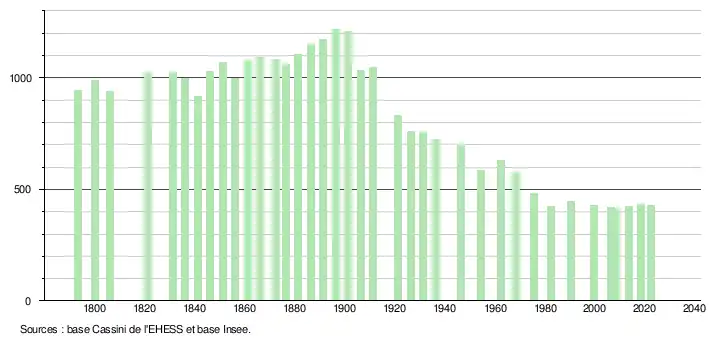 L'évolution du nombre d'habitants est connue à travers les recensements de la population effectués dans la commune depuis 1793. Pour les communes de moins de 10 000 habitants, une enquête de recensement portant sur toute la population est réalisée tous les cinq ans, les populations de référence des années intermédiaires étant quant à elles estimées par interpolation ou extrapolation[22]. Pour la commune, le premier recensement exhaustif entrant dans le cadre du nouveau dispositif a été réalisé en 2008[23].