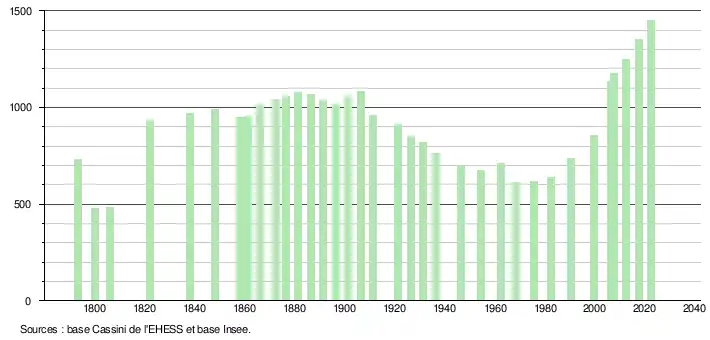 L'évolution du nombre d'habitants est connue à travers les recensements de la population effectués dans la commune depuis 1793. Pour les communes de moins de 10 000 habitants, une enquête de recensement portant sur toute la population est réalisée tous les cinq ans, les populations de référence des années intermédiaires étant quant à elles estimées par interpolation ou extrapolation[23]. Pour la commune, le premier recensement exhaustif entrant dans le cadre du nouveau dispositif a été réalisé en 2007[24].