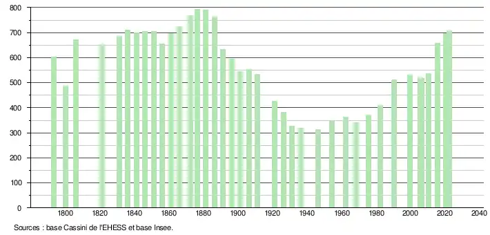 L'évolution du nombre d'habitants est connue à travers les recensements de la population effectués dans la commune depuis 1793. Pour les communes de moins de 10 000 habitants, une enquête de recensement portant sur toute la population est réalisée tous les cinq ans, les populations de référence des années intermédiaires étant quant à elles estimées par interpolation ou extrapolation[17]. Pour la commune, le premier recensement exhaustif entrant dans le cadre du nouveau dispositif a été réalisé en 2005[18].