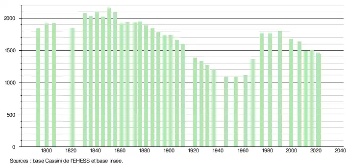 L'évolution du nombre d'habitants est connue à travers les recensements de la population effectués dans la commune depuis 1793. Pour les communes de moins de 10 000 habitants, une enquête de recensement portant sur toute la population est réalisée tous les cinq ans, les populations de référence des années intermédiaires étant quant à elles estimées par interpolation ou extrapolation[30]. Pour la commune, le premier recensement exhaustif entrant dans le cadre du nouveau dispositif a été réalisé en 2006[31].