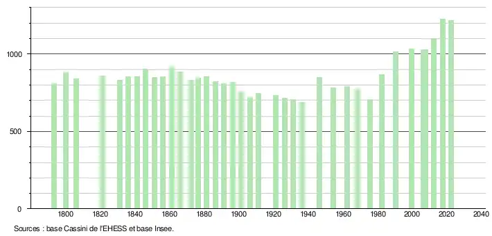 L'évolution du nombre d'habitants est connue à travers les recensements de la population effectués dans la commune depuis 1793. Pour les communes de moins de 10 000 habitants, une enquête de recensement portant sur toute la population est réalisée tous les cinq ans, les populations de référence des années intermédiaires étant quant à elles estimées par interpolation ou extrapolation[20]. Pour la commune, le premier recensement exhaustif entrant dans le cadre du nouveau dispositif a été réalisé en 2007[21].